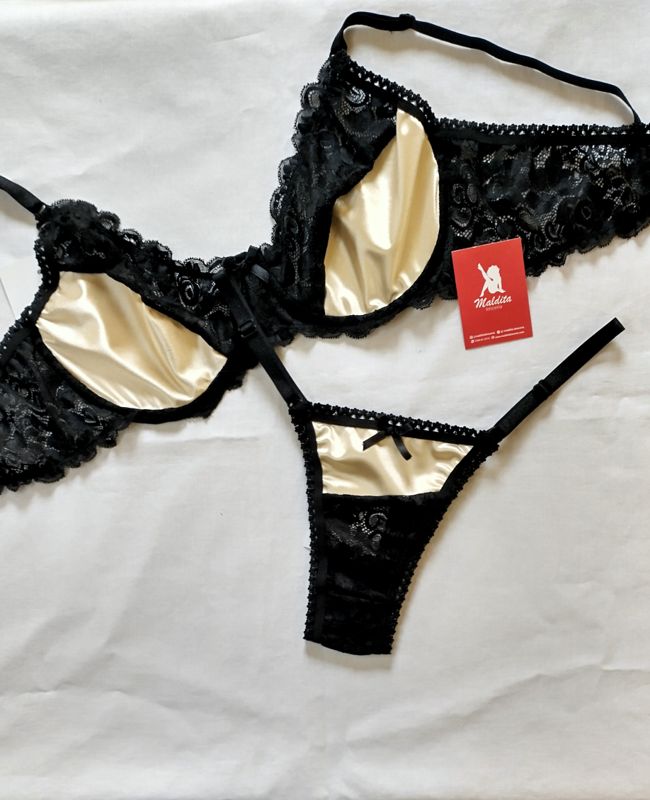 Conjunto de encaje combinado con satén y aro en taza, contiene colaless regulable tiro alto, es un diseño muy cómodo y elegante.