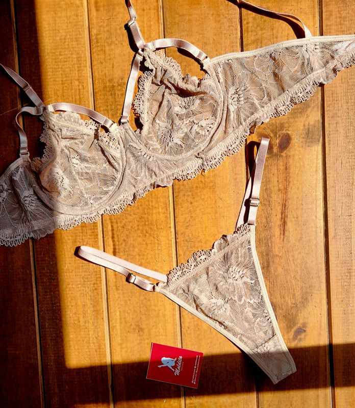 Conjunto de encaje Nude con tiras en el pecho y aro, con colaless regulable. Es muy delicado y sobretodo cómodo.